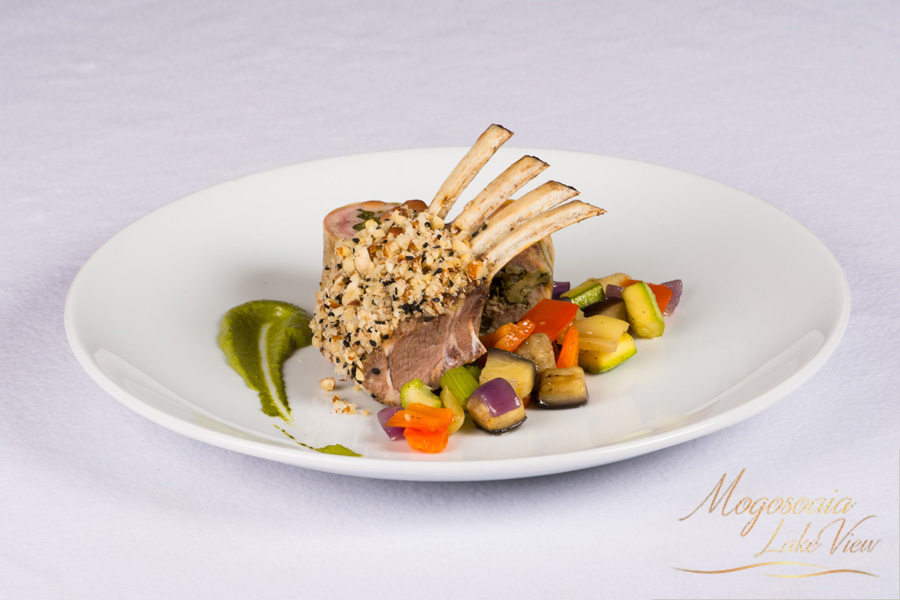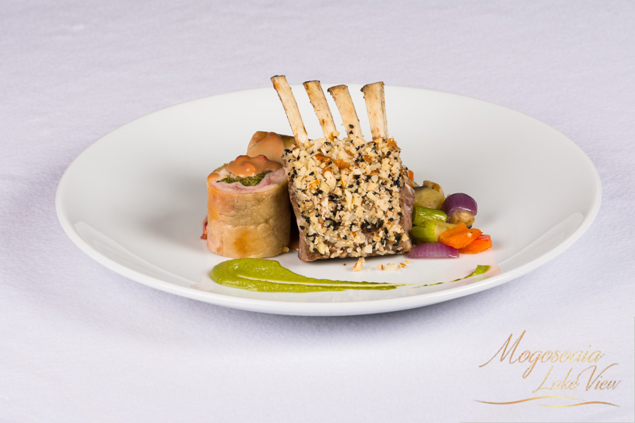 Cotlet de miel in crusta de seminte, pulpe de pui umplute cu spanac garnisit cu ratatouille de legume si sos de menta