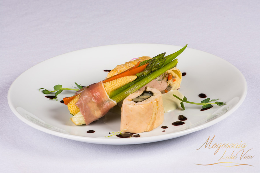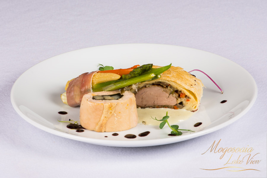 Muschiulet de porc Wellington cu rulada de pui cu sparanghel garnisit cu buchet de legume si sos de vin