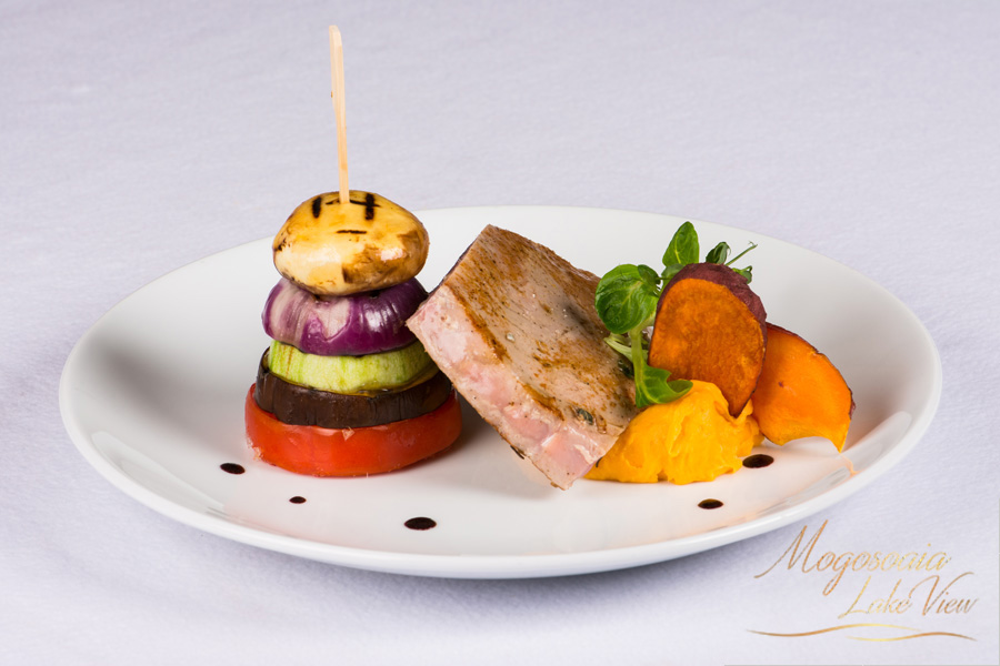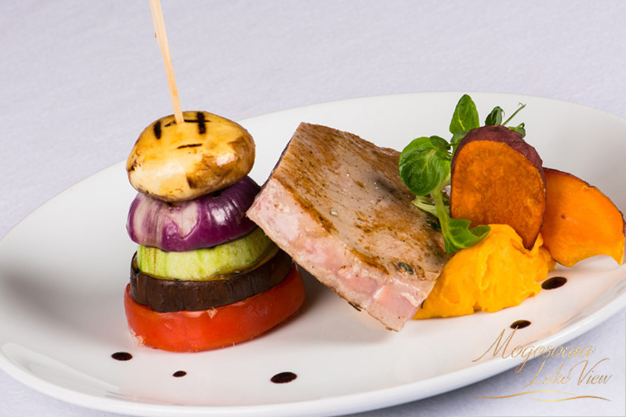 File de ton rosu cu turnulet de legume pe pat de piure de cartofi dulci