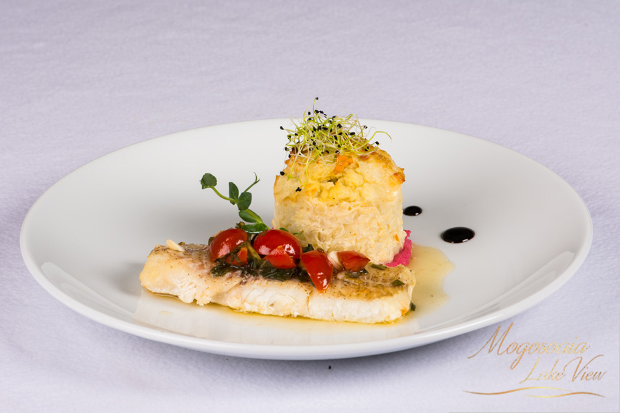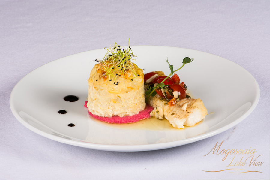 Halibut gatit in vid garnisit cu sufle de conopida si sfecla rosie cu sos provence